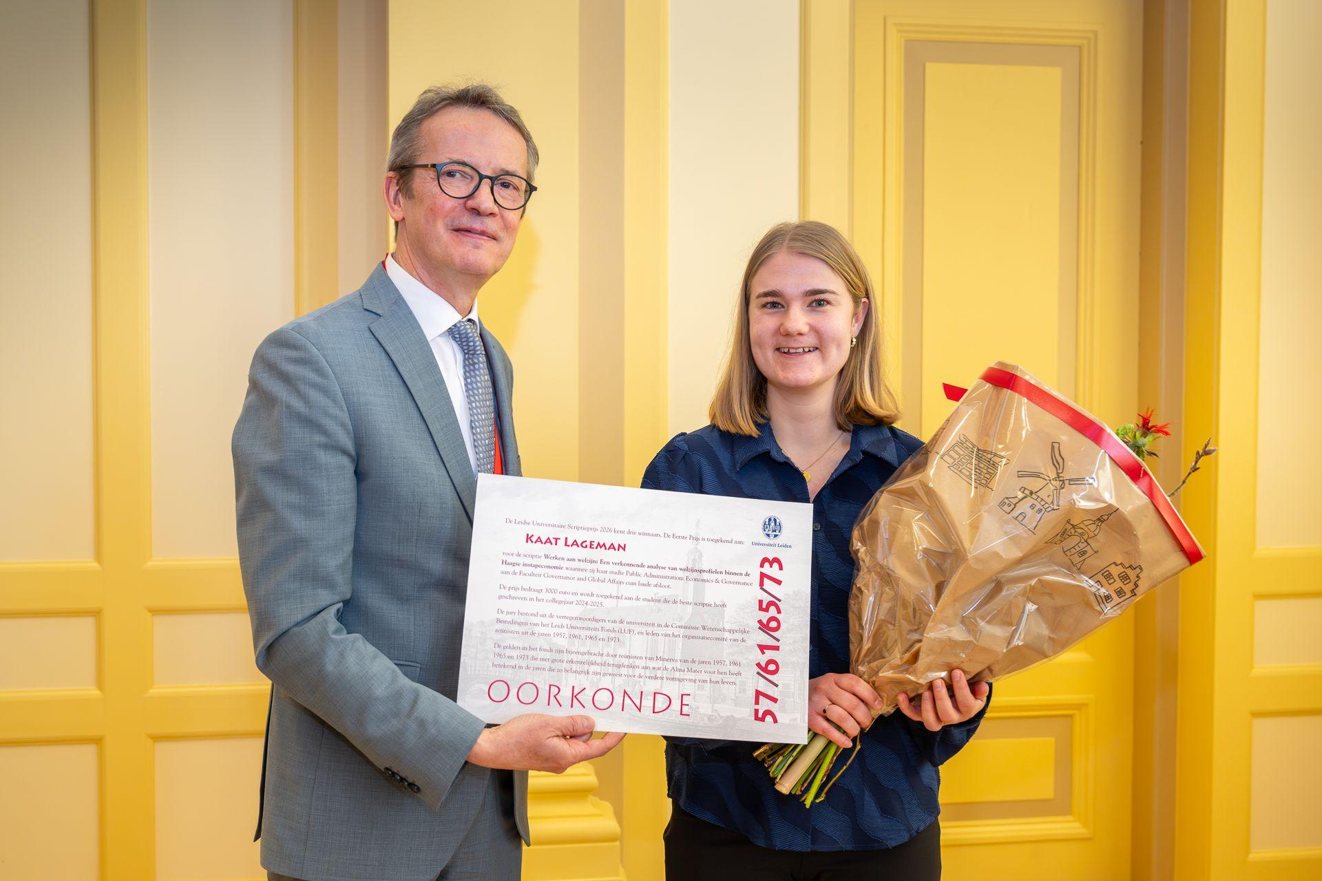 Lageman bij de prijsuitreiking: ‘Tijdens het schrijven van mijn scriptie realiseerde ik me hoe belangrijk dat maatwerk is. Extra bijzonder is dat de jury van de Leidse Universitaire Scriptieprijzen de maatschappelijke relevantie van dit onderzoek heeft erkend.’