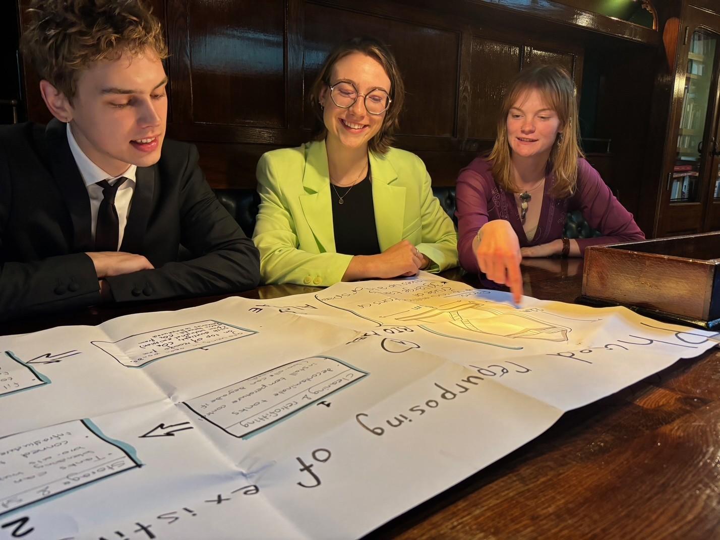 Het team, bestaande uit zes studenten van de minor, werkte aan de casus rond de internationale energietransitie. Met uiteenlopende academische achtergronden – van sociologie en antropologie tot bouwkunde en landschapsarchitectuur – kwamen verschillende perspectieven samen in één interdisciplinair team. 'Ik denk dat de verschillende disciplines uiteindelijk echt hebben geholpen in het proces naar ons uiteindelijke idee', vertelt Noa Yentl Smit, student Cultural Anthropology and Development Sociology aan de Universiteit Leiden.